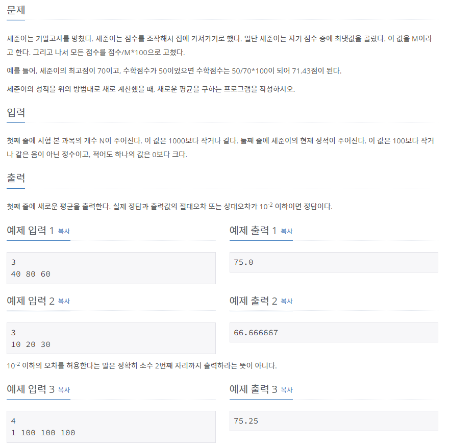 이 문제는 세준이의 점수를 입력 받고, 그 중 최댓값을 찾아 M이라구 했을 떄,