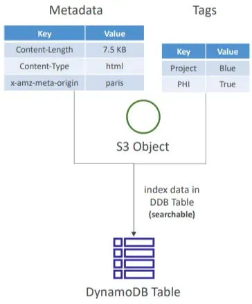 - 예를 들어, DynamoDB에 메타데이터와 태그를 저장한 후, 이 데이터를 검색하고 해당 검색 결과로 S3 객체를 찾을 수 있다.'