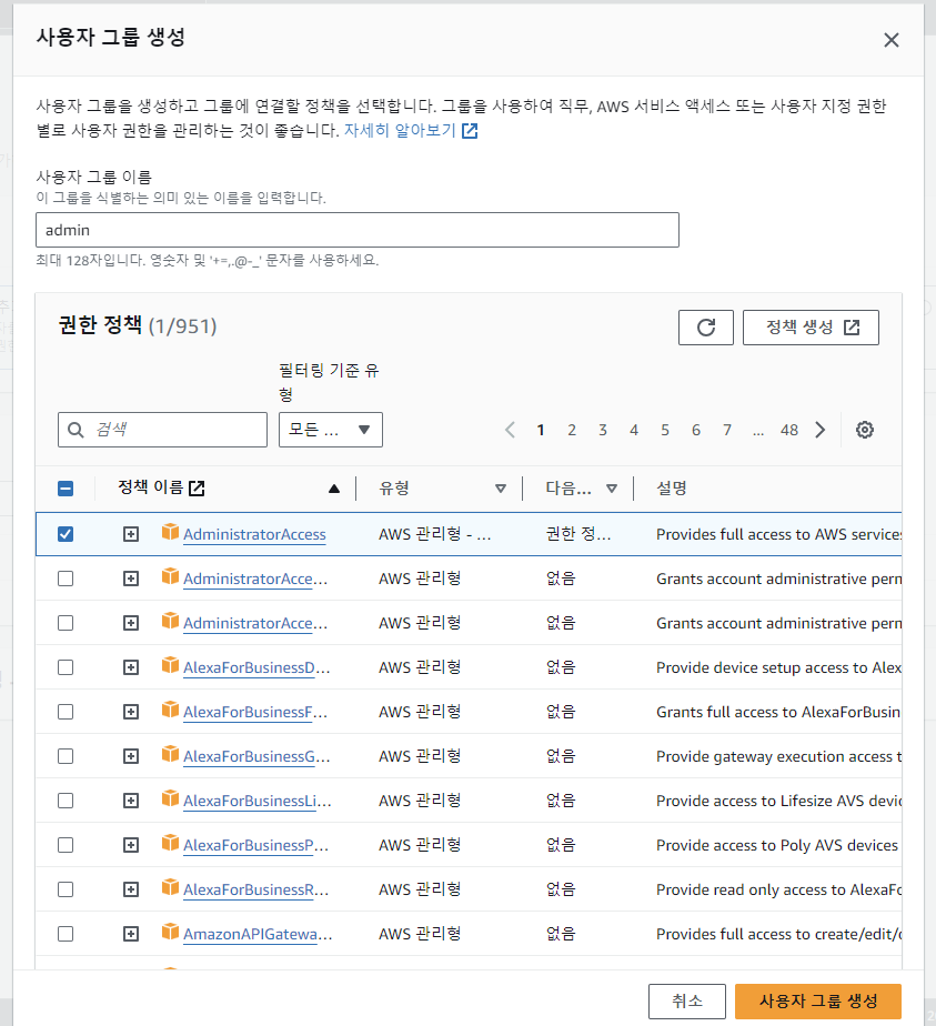- admin 그룹에 AdministratorAccess 정책을 넣어 그룹 생성