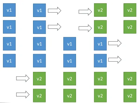 - 첫 번째 단계에서, 기존 태스크를 모두 유지한 상태로 2개의 V2 태스크를 생성하여 150% 용량으로 늘어난다.