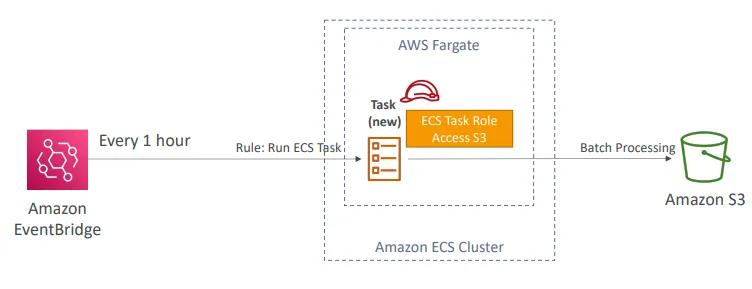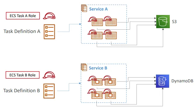 - ECS 태스크 역할은 태스크가 실행될 때 적용되며, 서로 다른 서비스에 대한 권한을 태스크별로 정의할 수 있다. 예를 들어, 하나의 태스크는 S3에, 다른 태스크는 DynamoDB에 접근할 수 있다.