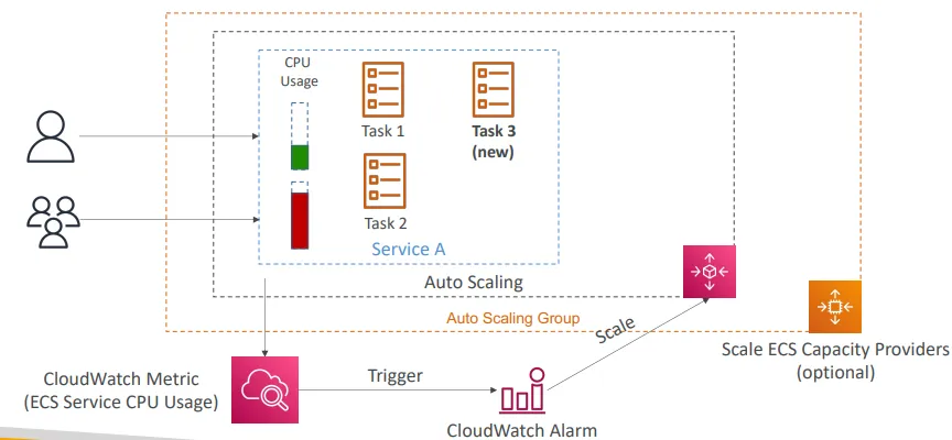 - Amazon ECS에서는 자동 확장(Auto Scaling) 기능을 통해 서비스의 ECS 태스크 수를 자동으로 증가시키거나 감소시킬 수 있다.